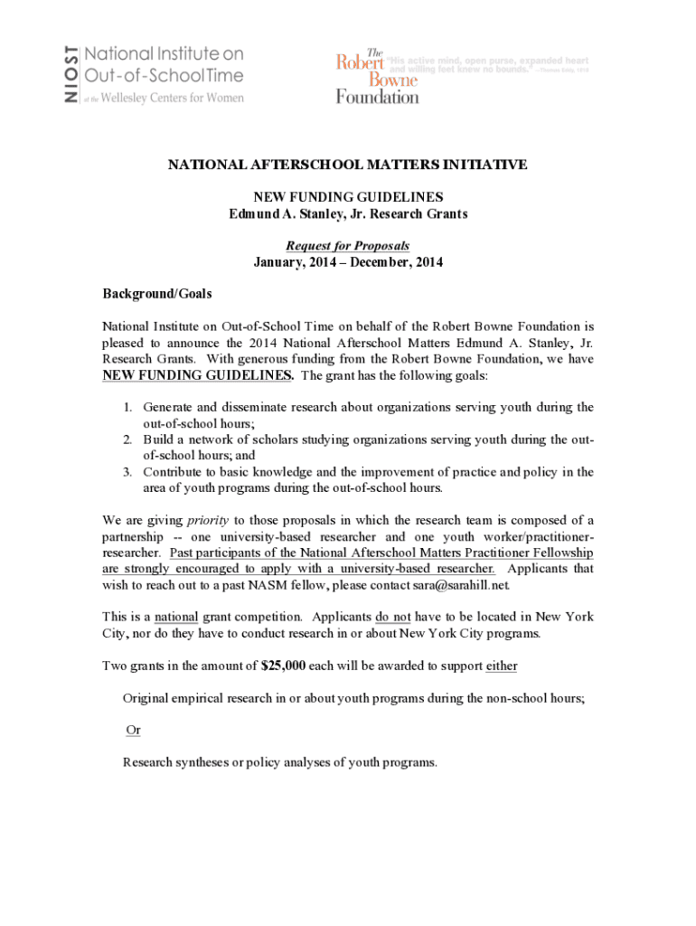 This document outlines the 2014 National Afterschool Matters Edmund A. Stanley, Jr. Research Grants funded by the Robert Bowne Foundation. It details the goals of generating and disseminating research about organizations serving youth during out-of-school hours, building a network of scholars, and contributing to the knowledge and improvement of youth programs. The document specifies eligibility criteria, areas of research focus, application instructions, and submission deadlines.