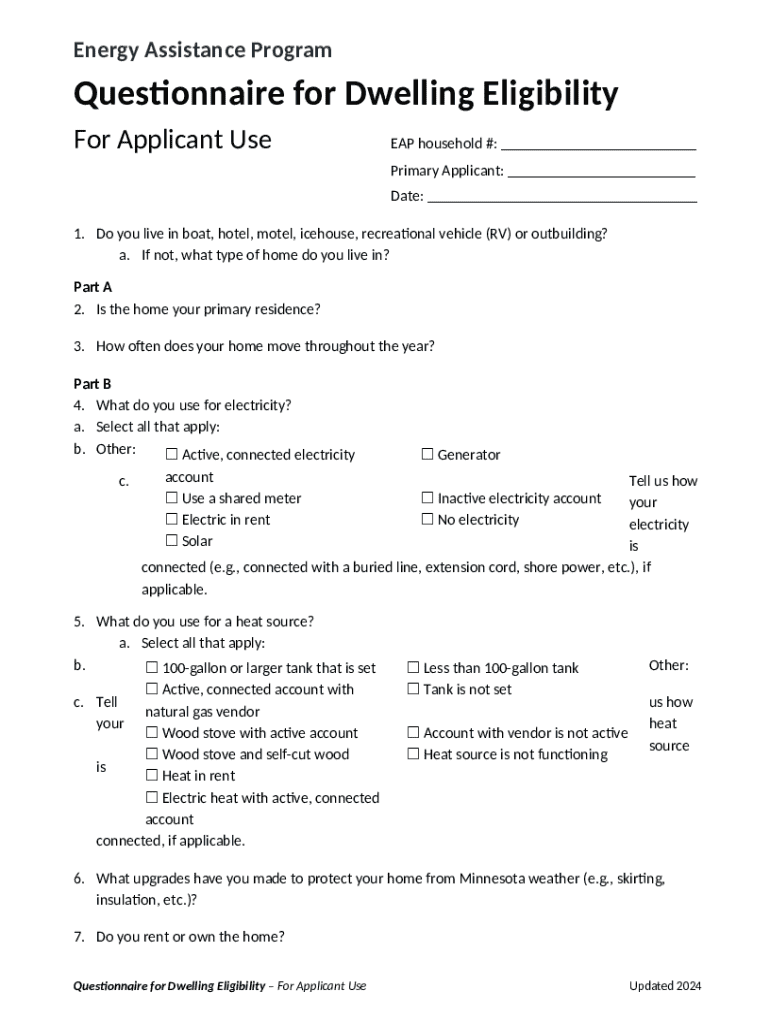 Template Questionnaire for Dwelling Eligibility instructions