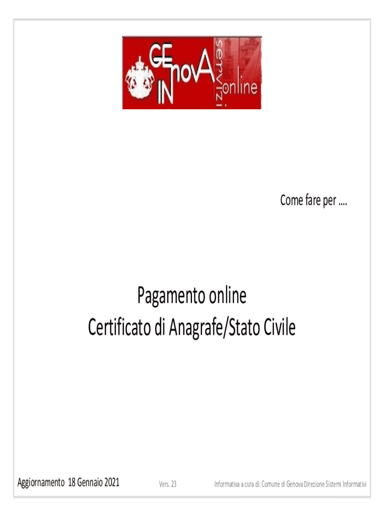 Come fare per .Pagamento online Certificato di Anagrafe/Stato CivileAggiornamento 18 Gennaio 2021Vers. 23Informativa a cura di: Comune di Genova Direzione Sistemi InformativiIl Comune di Genova per