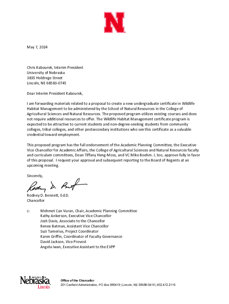 May 7, 2024Chris Kabourek, Interim President University of Nebraska 3835 Holdrege Street Lincoln, NE 685830745 Dear Interim President Kabourek, I am forwarding materials related to a proposal to create