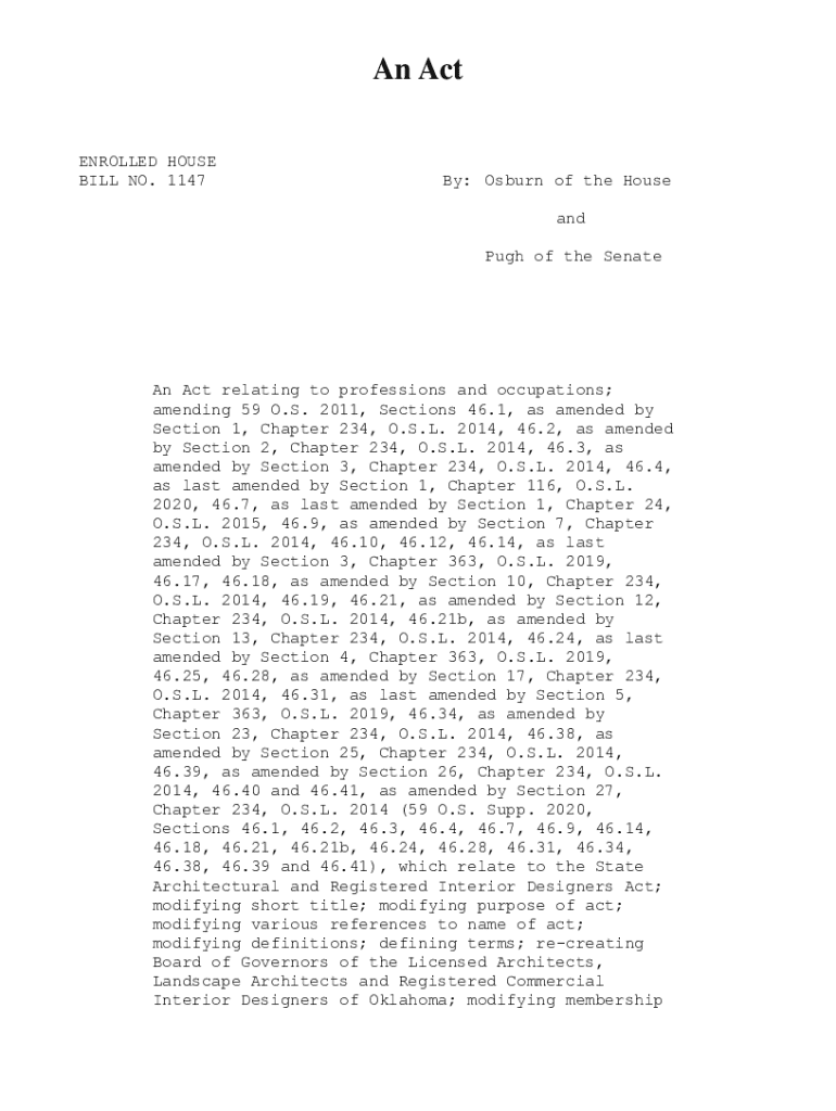 An Act amending the State Architectural and Registered Commercial Interior Designers Act, relating to professions and occupations in Oklahoma. It modifies various sections, definitions, and the structure of the Board of Governors overseeing the licensing and registration of architects, landscape architects, and registered commercial interior designers. The act establishes guidelines for the practice of these professions, the issuance of licenses, and the penalties for violations.