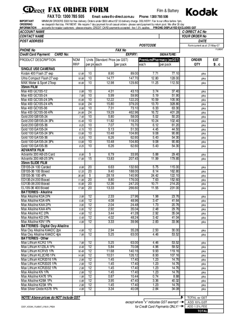 FAX ORDER FORM FAX TO: 1300 785 505 IMPORTANT ORDERING INFORMATIONFilm & BatteryEmail: sales@cdirect.com.auPhone: 1300 785 506MINIMUM ORDERS: $500 for free delivery. Orders under $500 attract $7.50