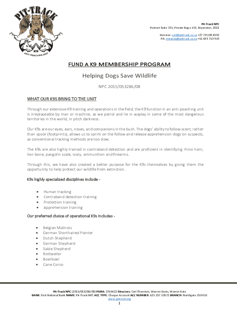 PitTrack NPC Postnet Suite 725, Private Bag x 153, Bryanston, 2021 Director: carl@pittrack.co.za +27 78 109 4392 PA: miranda@pittrack.co.za +61 433 713 919FUND A K9 MEMBERSHIP PROGRAMHelping Dogs
