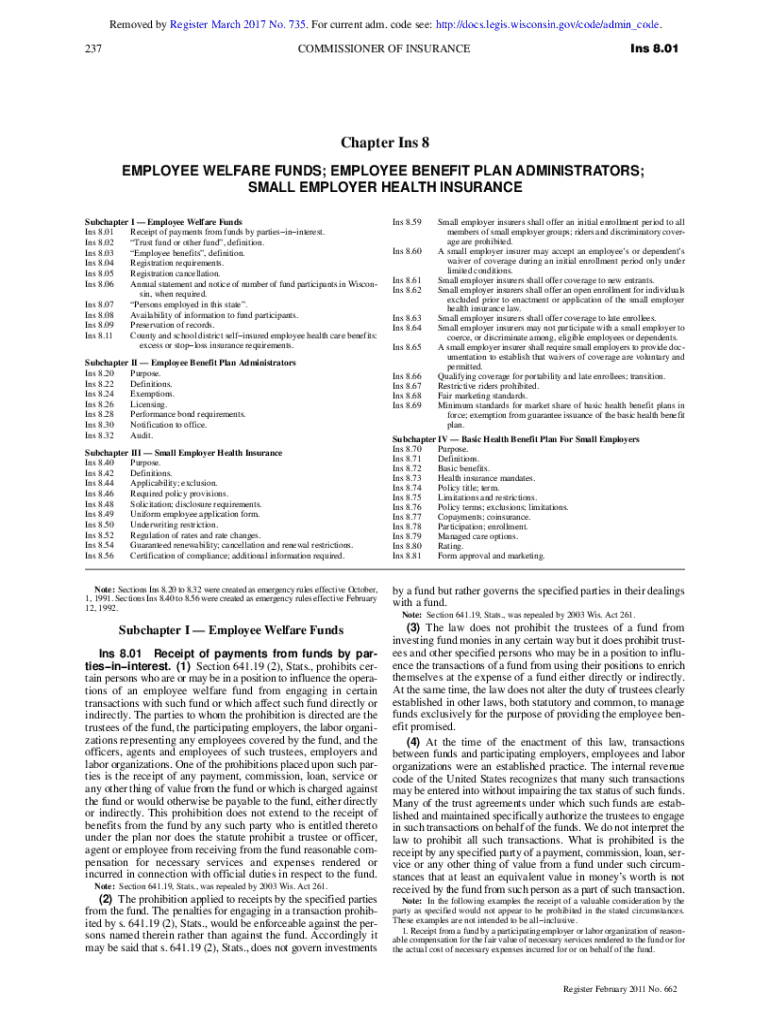 Removed by Register March 2017 No. 735. For current adm. code see: http://docs.legis.wisconsin.gov/code/admin_code . 237COMMISSIONER OF INSURANCEIns 8.01Chapter Ins 8 EMPLOYEE WELFARE FUNDS; EMPLOYEE