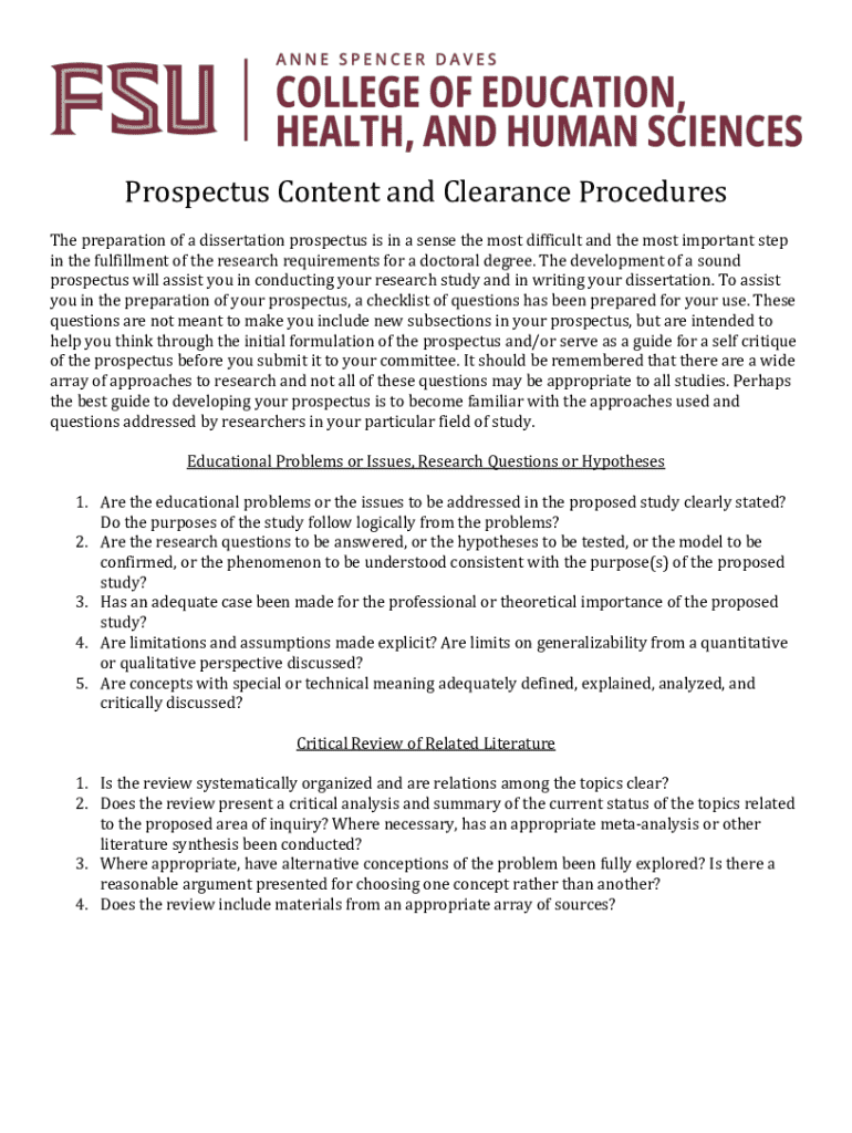 This document provides guidance on the preparation of a dissertation prospectus, outlining essential components such as educational problems, research questions, literature review, design and methodology, and clearance procedures for approval. It includes a checklist and a systematic outline to aid doctoral candidates in refining their prospectus before submission.