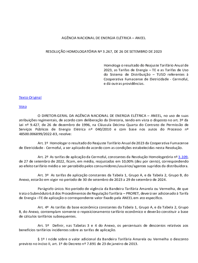 Esta resolução homologa o resultado do Reajuste Tarifário Anual de 2023, as Tarifas de Energia - TE e as Tarifas de Uso do Sistema de Distribuição - TUSD da Cooperativa Fumacense de Eletricidade
