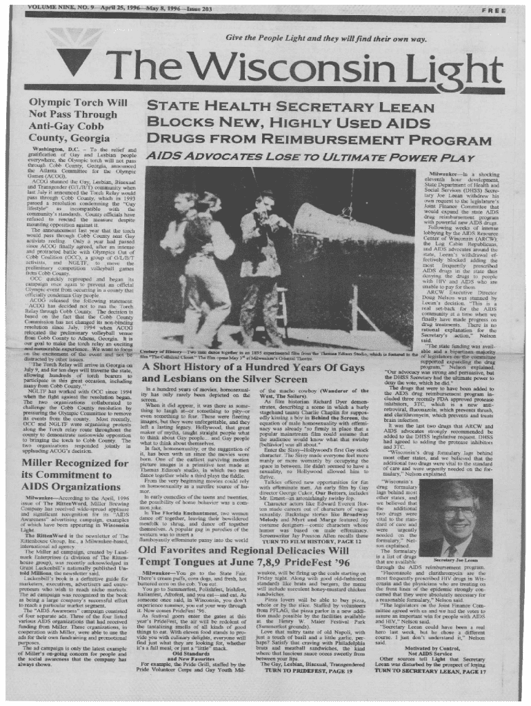 VOLUME NINE, NO. 9April 25, 1996May 8,1996Issue 203FREEGive the People Light and they willfind their own way.V The Wisconsin Light Olympic Torch Will Not Pass Through AntiGay Cobb County, Georgia
