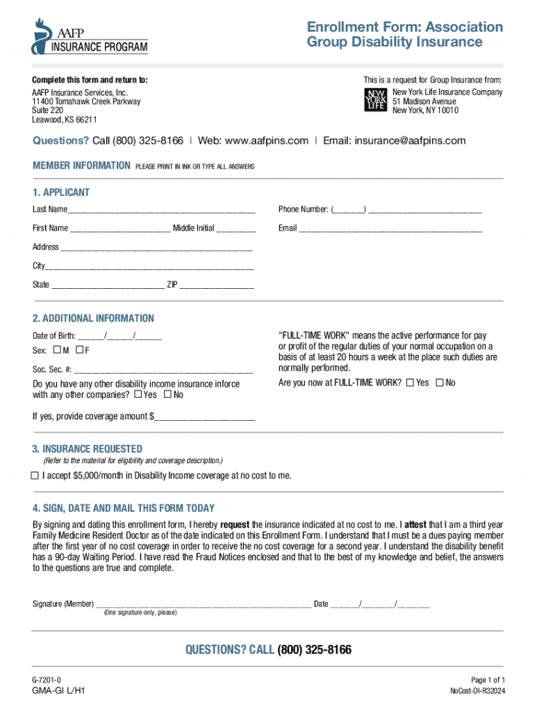 Enrollment Form: Association Group Disability Insurance This is a request for Group Insurance from: New York Life Insurance Company 51 Madison Avenue New York, NY 10010Complete this form and return