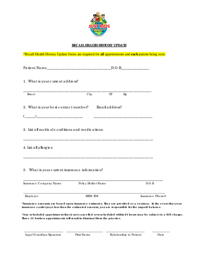 RECALL HEALTH HISTORY UPDATE *Recall Health History Update forms are required for all appointments and each patient being seen. Patient Name___D.O.B___ 1. What is your current address? ___ StreetCity2.