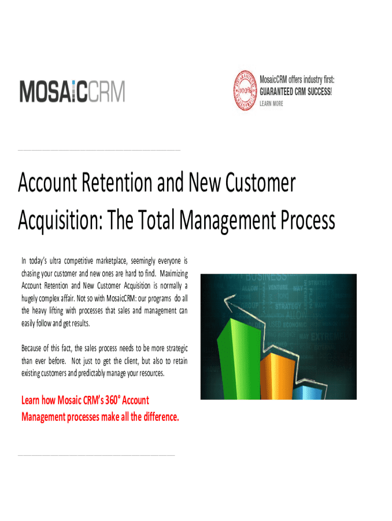 ___Account Retention and New Customer Acquisition: The Total Management Process In todays ultra competitive marketplace, seemingly everyone is chasing your customer and new ones are hard to find.