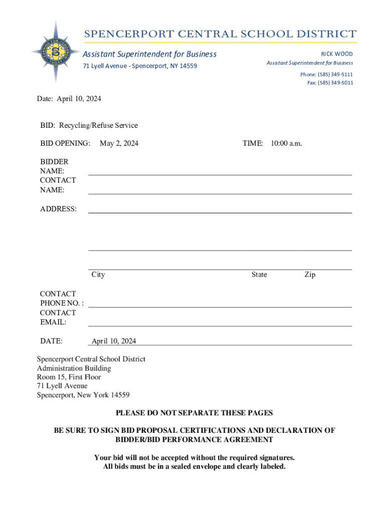 Assistant Superintendent for Business 71 Lyell Avenue Spencerport, NY 14559RICK WOOD Assistant Superintendent for Business Phone: (585) 3495111 Fax: (585) 3495011Date: April 10, 2024 BID: Recycling/Refuse