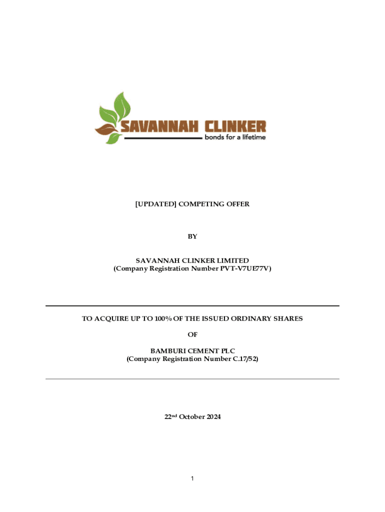[UPDATED] COMPETING OFFERBY SAVANNAH CLINKER LIMITED (Company Registration Number PVTV7UE77V)TO ACQUIRE UP TO 100% OF THE ISSUED ORDINARY SHARES OF BAMBURI CEMENT PLC (Company Registration Number