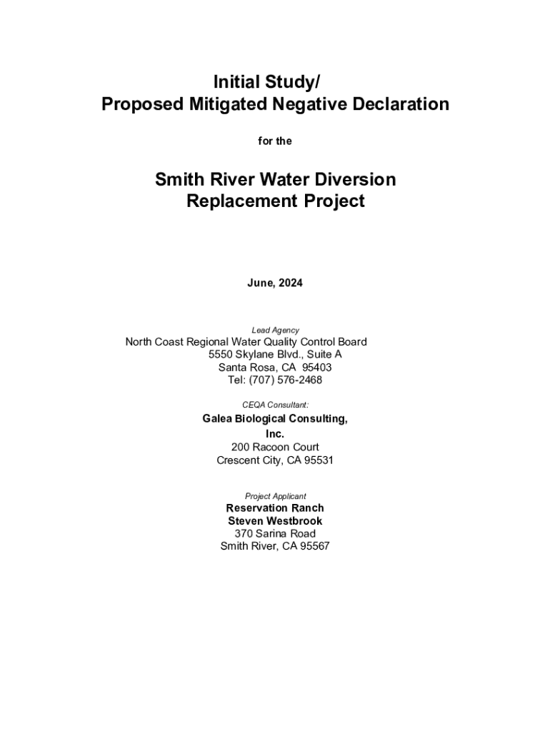 This document outlines the initial study and proposed mitigated negative declaration for the Smith River Water Diversion Replacement Project, which aims to replace an obsolete irrigation system to improve water conservation and mitigate impacts on sensitive biological resources.