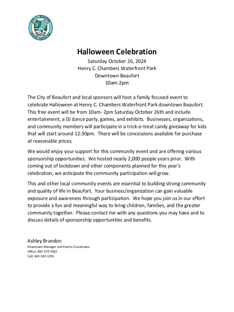Halloween Celebration Saturday October 26, 2024 Henry C. Chambers Waterfront Park Downtown Beaufort 10am2pm The City of Beaufort and local sponsors will host a family focused event to celebrate Halloween