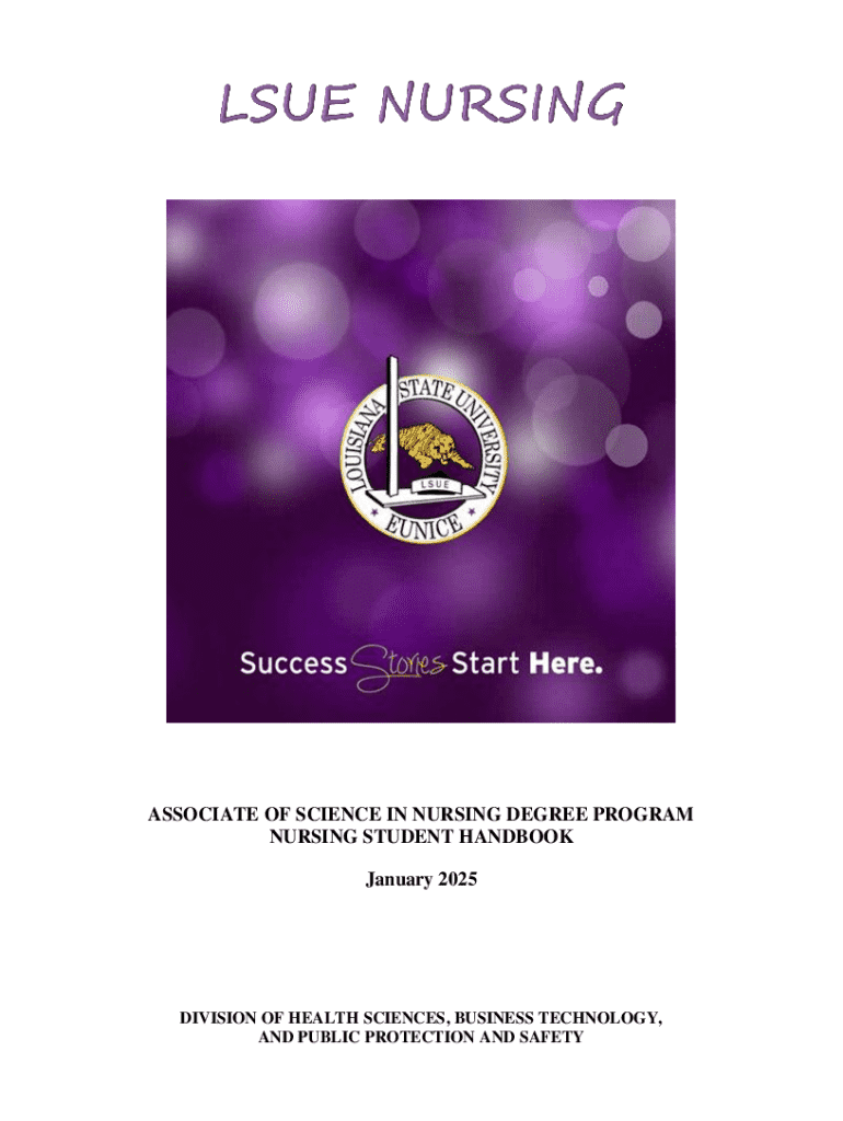 The LSUE Nursing Student Handbook serves as a comprehensive guide for students enrolled in the Associate of Science in Nursing Degree Program. It covers essential policies, admission processes, academic integrity, clinical practice guidelines, and program expectations. The handbook aims to ensure that nursing students understand their responsibilities, adhere to required standards, and successfully navigate their educational journey while prioritizing patient safety and holistic care.