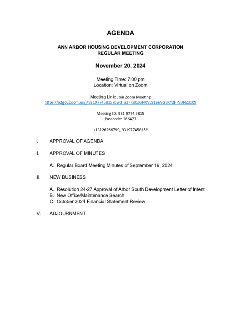 AGENDA ANN ARBOR HOUSING DEVELOPMENT CORPORATION REGULAR MEETINGNovember 20, 2024 Meeting Time: 7:00 pm Location: Virtual on Zoom Meeting Link: Join Zoom Meeting https://a2gov.zoom.us/j/93197745815?pwda2FRd0ZGNXVLS1BuVG9XY2FTVDNZdz09