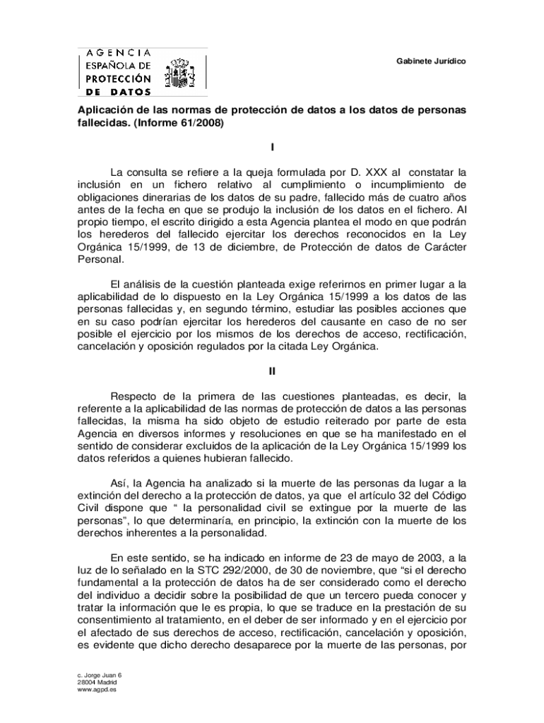 Gabinete JurdicoAplicacin de las normas de proteccin de datos a los datos de personas fallecidas. (Informe 61/2008) I La consulta se refiere a la queja formulada por D. XXX al constatar la inclusin