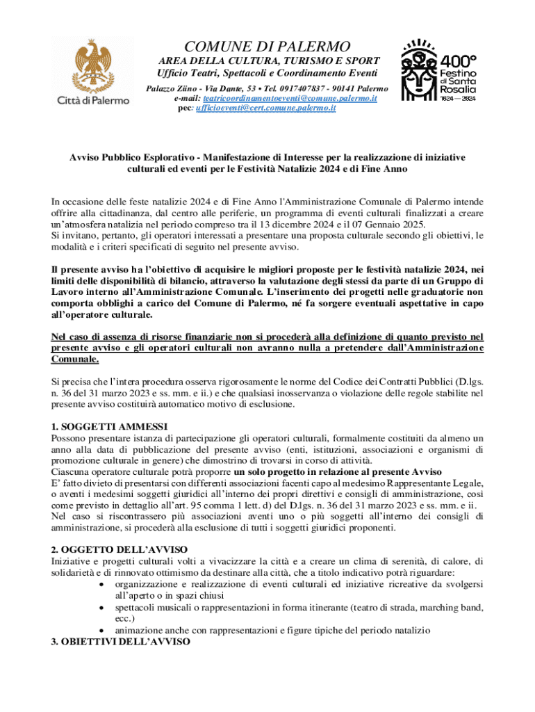 COMUNE DI PALERMO AREA DELLA CULTURA, TURISMO E SPORT Ufficio Teatri, Spettacoli e Coordinamento Eventi Palazzo Ziino Via Dante, 53 Tel. 0917407837 90141 Palermo email: teatricoordinamentoeventi@comune.palermo.it