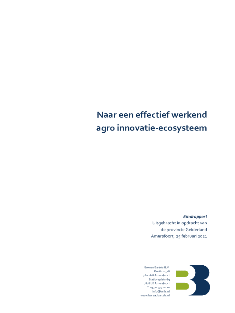 Naar een effectief werkend agro innovatieecosysteemEindrapport Uitgebracht in opdracht van de provincie Gelderland Amersfoort, 25 februari 2021Bureau Bartels B.V. Postbus 318 3800 AH Amersfoort Stationsplein
