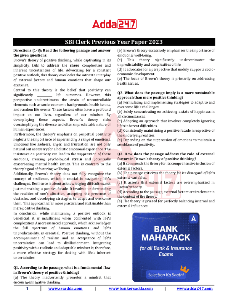 SBI Clerk Previous Year Paper 2023 Directions (18): Read the following passage and answer the given questions. Brown\'s theory of positive thinking, while captivating in its simplicity, fails to address