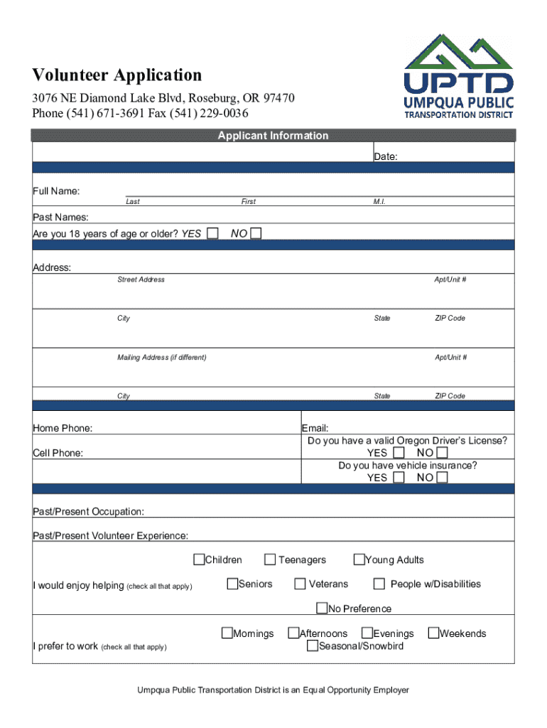 This document is an application form for individuals interested in volunteering with Umpqua Public Transportation District. It collects personal information, volunteer preferences, and contact details for emergency contacts and references.