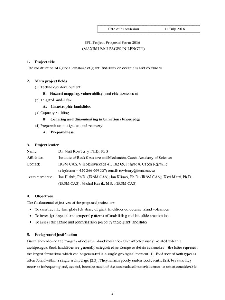 Date of Submission31 July 2016IPL Project Proposal Form 2016 (MAXIMUM: 3 PAGES IN LENGTH)1.Project titleThe construction of a global database of giant landslides on oceanic island volcanoes2.Main