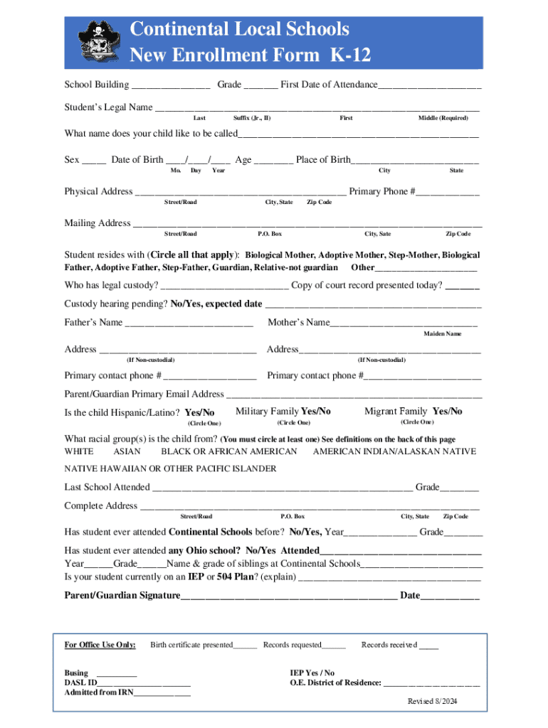 This form is required for enrolling students in Continental Local Schools from K-12. It collects essential information about the student, legal guardians, and previous educational history.