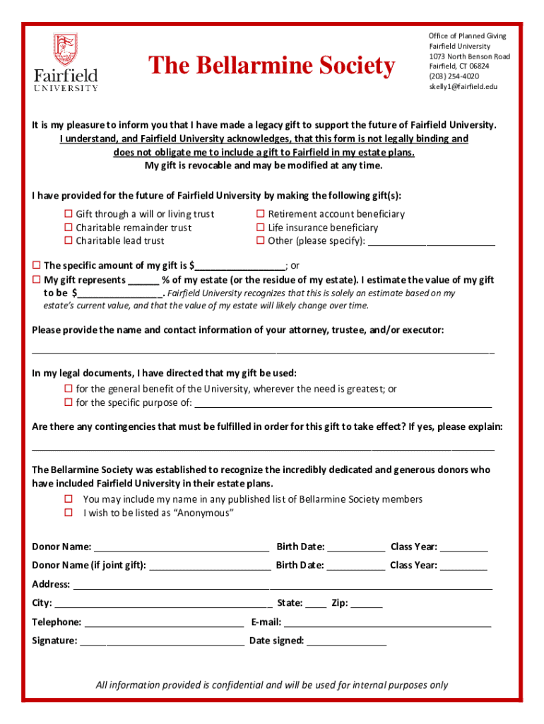 This form is used by donors to make a legacy gift to Fairfield University as part of the Bellarmine Society. It allows individuals to express their intention to include the university in their estate plans, describe the nature of their gift, and provide necessary personal and financial information. The form also emphasizes that the gift is revocable and not legally binding, ensuring donors can modify their plans as needed.