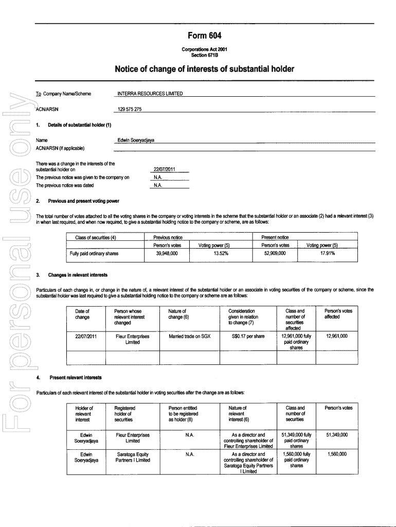 Get the free Notice of Change of Interest of Substantial Holder (ASIC Form 604 x 3)