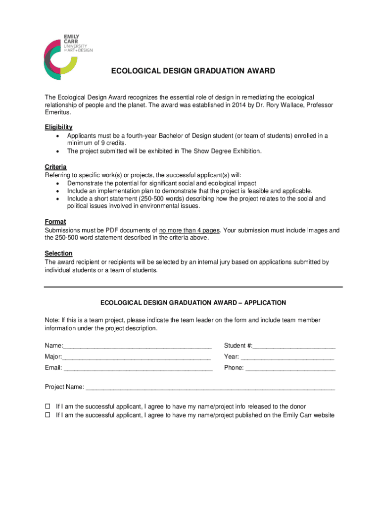 To fill out the ecological design graduation award, students usually need to complete an application form, provide supporting documents like project portfolios, and submit them to the relevant academic department.