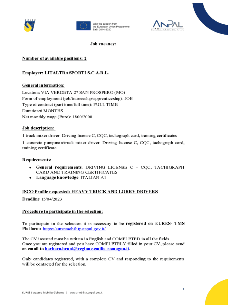 Job vacancy: Number of available positions: 2 Employer: LITALTRASPORTI S.C.A.R.L. General information: Location: VIA VERDETA 27 SAN PROSPERO (MO) Form of employment (job/traineeship/apprenticeship):