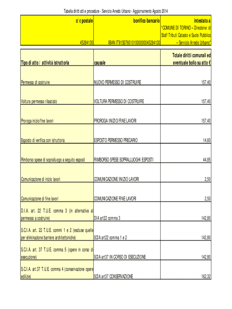 Tabella diritti atti e procedure Servizio Arredo Urbano Aggiornamento Agosto 2014c/c postalebonifico bancariointestato a COMUNE DI TORINO Direzione di Staff Tributi Catasto e Suolo Pubblico Servizio