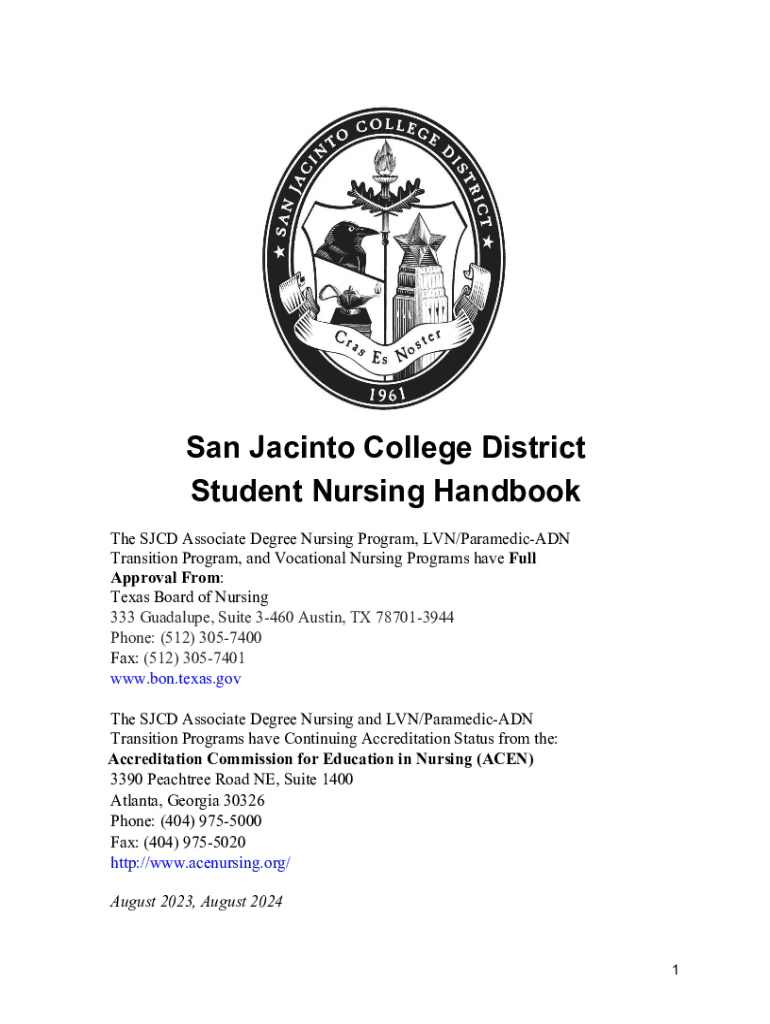 San Jacinto College District Student Nursing Handbook The SJCD Associate Degree Nursing Program, LVN/ParamedicADN Transition Program, and Vocational Nursing Programs have Full Approval From: Texas