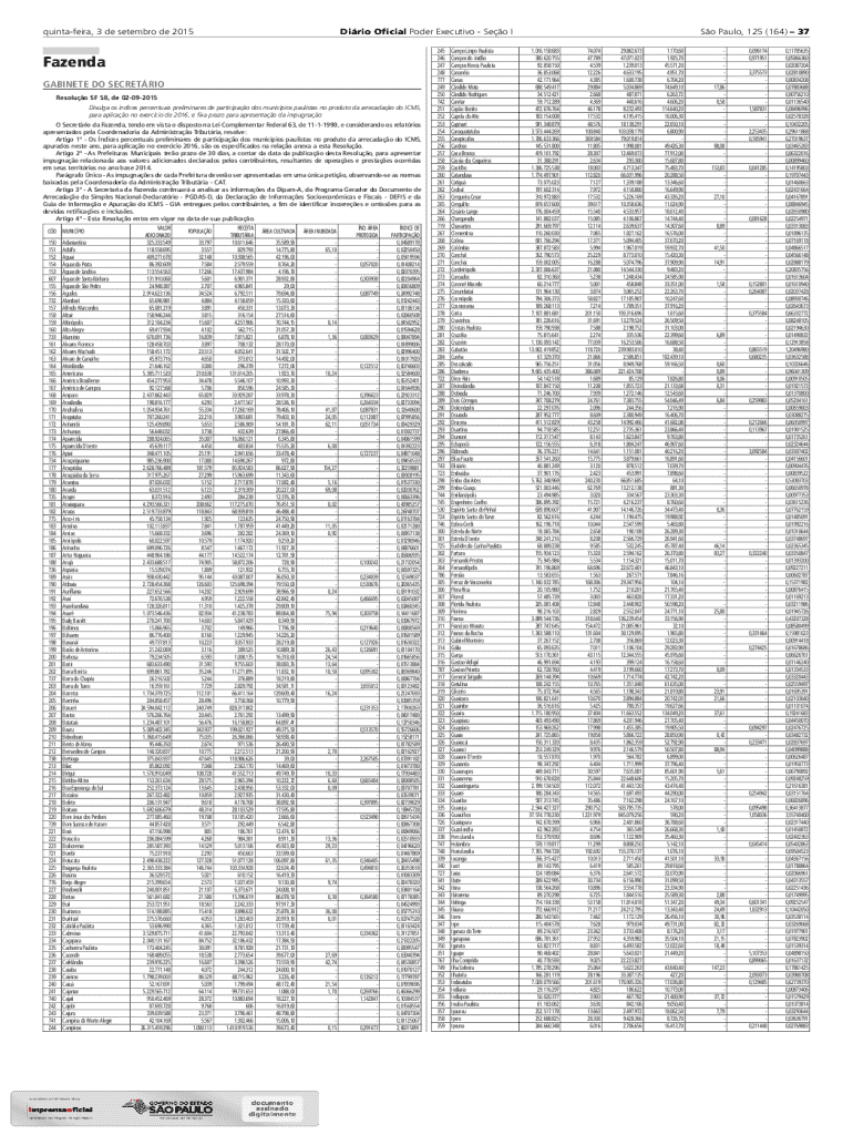 quintafeira, 3 de setembro de 2015Dirio Oficial Poder Executivo Seo IFazenda GABINETE DO SECRETRIO Resoluo SF 58, de 02092015 Divulga os ndices percentuais preliminares de participao dos municpios