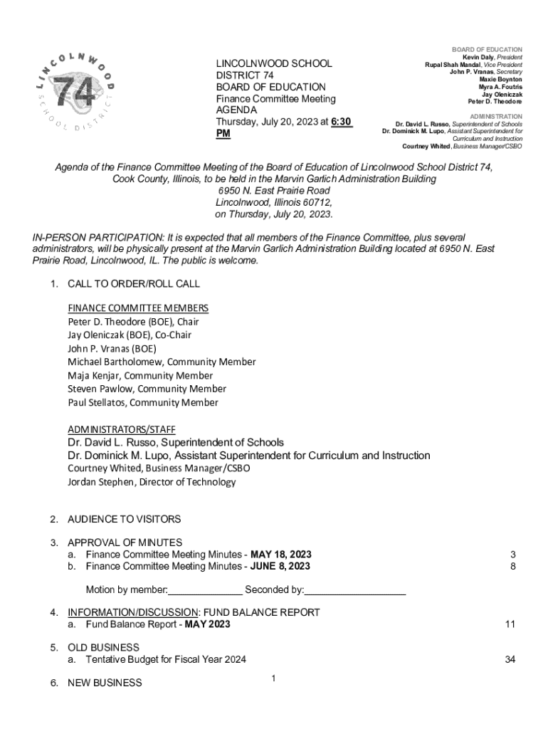Get the free Lincolnwood School District 74 Finance Committee Meeting Agenda
