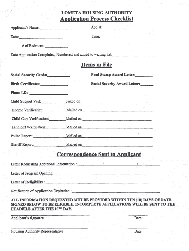 This document outlines the application process checklist for the Lometa Housing Authority, detailing required items, consequences of fraud, eligibility verification, and the waiting list policy. It serves as a guide for applicants to collect necessary documents and understand the responsibilities that come with obtaining public housing assistance.