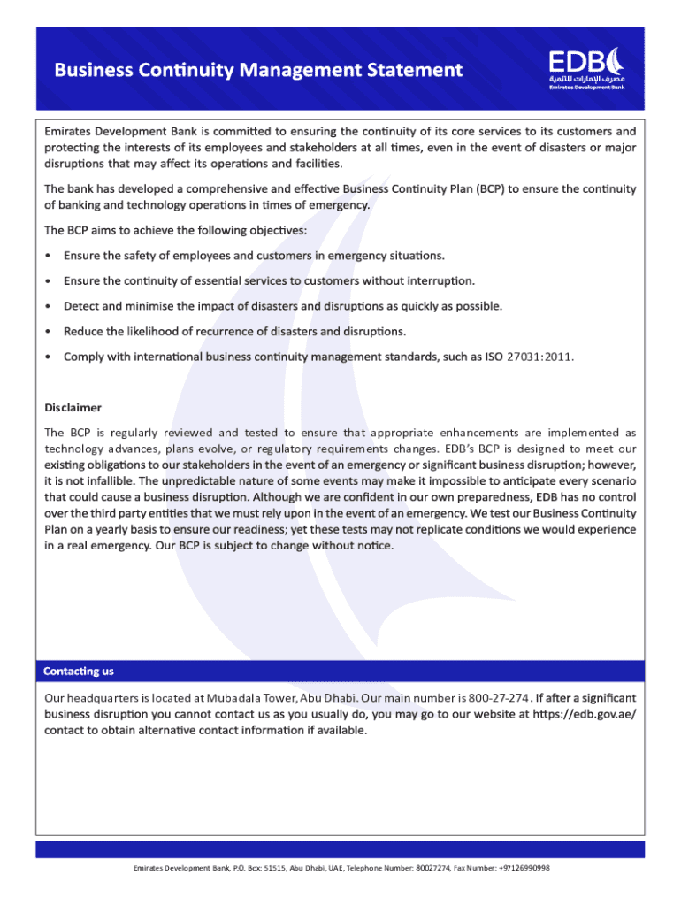 27031: 2011 .Disclaimer The BCP is regularly reviewed and tested to ensure that appropriate enhancements are implemented as technology advances, plans evolve, or regulatory requirements changes. EDBs