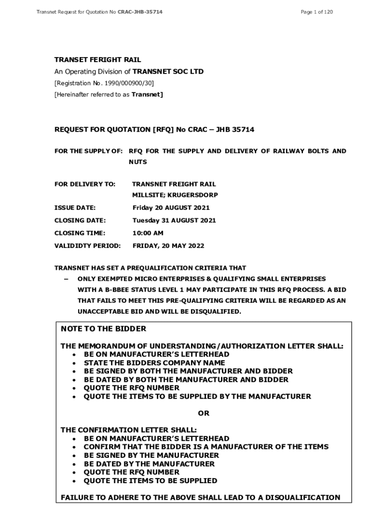 Transnet Request for Quotation No CRACJHB35714Page 1 of 120TRANSET FERIGHT RAIL An Operating Division of TRANSNET SOC LTD [Registration No. 1990/000900/30] [Hereinafter referred to as Transnet]REQUEST