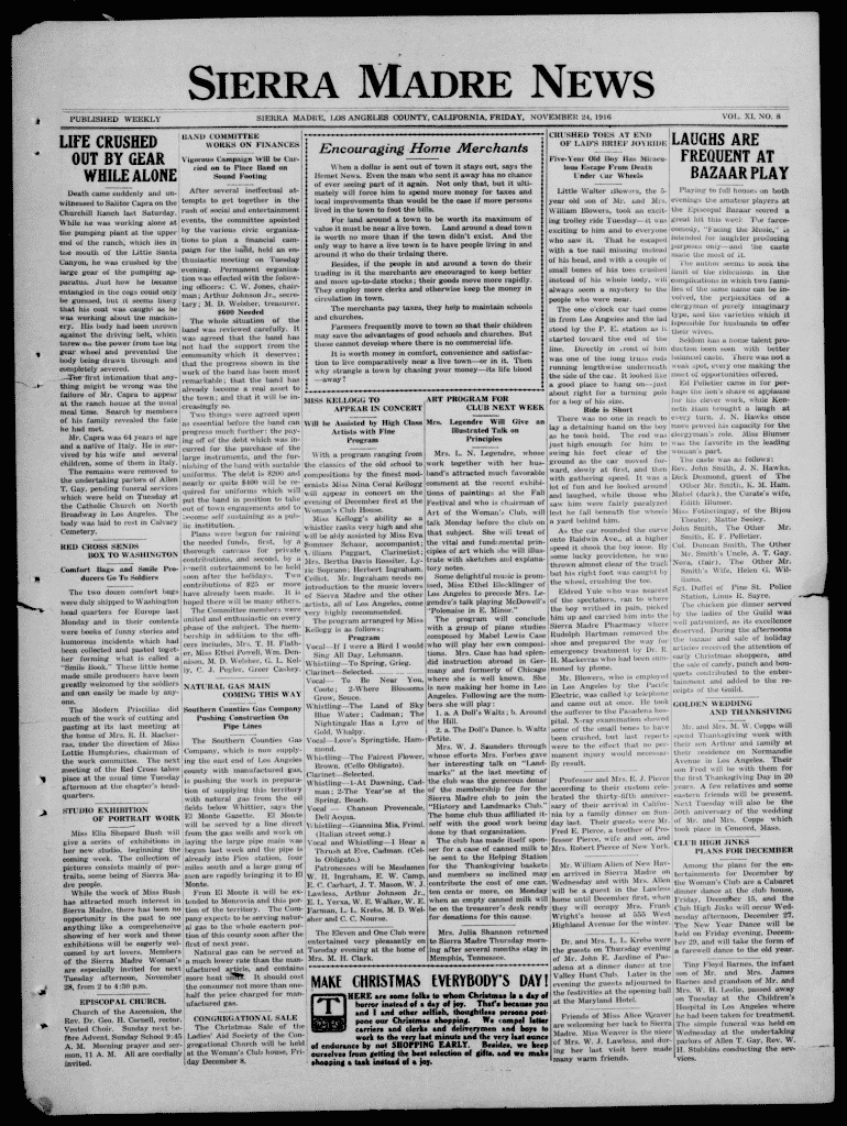 Sierra Madre N ews PUBLISHED WEEKLYSIERRA MADRE, LOS ANGELES COUNTY, CALIFORNIA, FRIDAY, NOVEMBER 24, 1916 BAND COMMITTEE WORKS ON FINANCESLIFE CRUSHED Campaign Will be Car OUT BY GEAR Vigorous ried