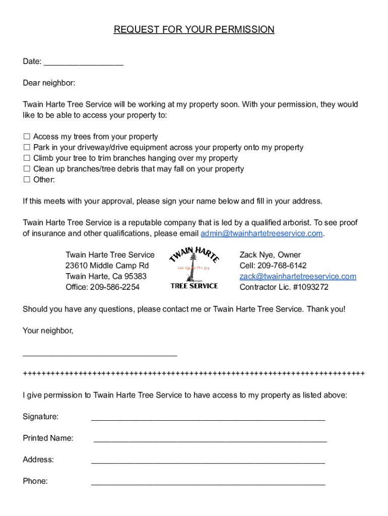 REQUEST FOR YOUR PERMISSION Date: ___ Dear neighbor: Twain Harte Tree Service will be working at my property soon. With your permission, they would like to be able to access your property to: Access