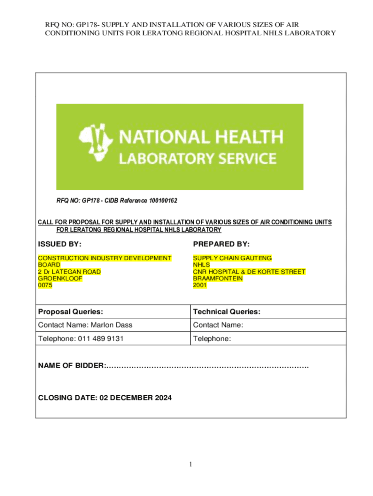 This document is a Request for Quotation for the supply and installation of various sizes of air conditioning units specifically for the Leratong Regional Hospital NHLS Laboratory. It includes detailed specifications, requirements for bidders, and the conditions under which the bids must be submitted and evaluated.