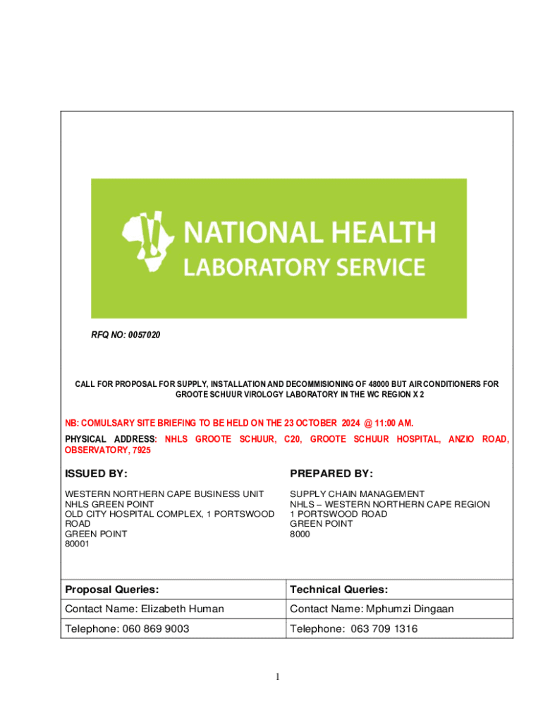 RFQ NO: 0057020CALL FOR PROPOSAL FOR SUPPLY, INSTALLATION AND DECOMMISIONING OF 48000 BUT AIR CONDITIONERS FOR GROOTE SCHUUR VIROLOGY LABORATORY IN THE WC REGION X 2NB: COMULSARY SITE BRIEFING TO
