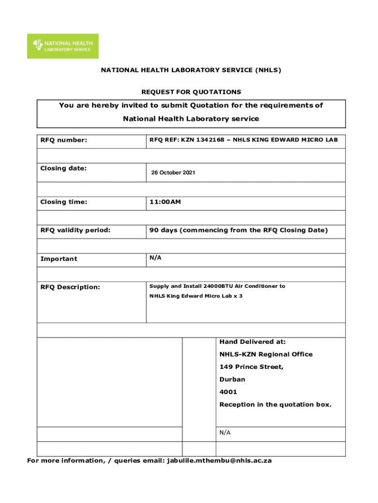 NATIONAL HEALTH LABORATORY SERVICE (NHLS) REQUEST FOR QUOTATIONSYou are hereby invited to submit Quotation for the requirements of National Health Laboratory service RFQ number:Closing date:RFQ REF: