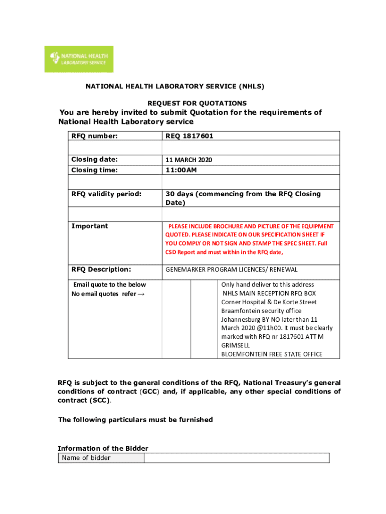 NATIONAL HEALTH LABORATORY SERVICE (NHLS) REQUEST FOR QUOTATIONSYou are hereby invited to submit Quotation for the requirements of National Health Laboratory service RFQ number:REQ 1817601Closing
