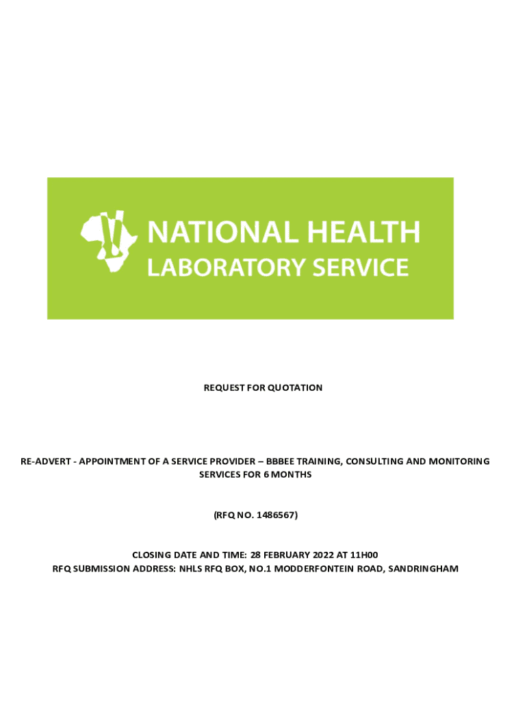This document is a Request for Quotation (RFQ) for the appointment of a service provider to offer BBBEE training, consulting, and monitoring services for a period of six months, issued by the National Health Laboratory Service (NHLS). The RFQ details the requirements, terms and conditions, submission guidelines, and evaluation criteria necessary for potential bidders to respond.