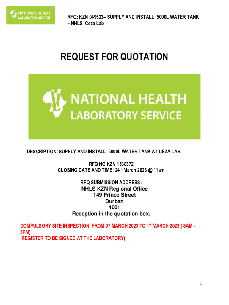 RFQ: KZN 049523 SUPPLY AND INSTALL 5000L WATER TANK NHLS Ceza LabREQUEST FOR QUOTATIONDESCRIPTION: SUPPLY AND INSTALL 5000L WATER TANK AT CEZA LAB RFQ NO KZN 1538372 CLOSING DATE AND TIME: 24th March