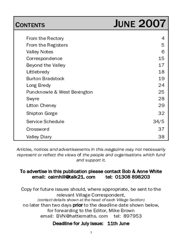 JUNE 2007CONTENTS From the Rectory From the Registers Valley Notes Correspondence Beyond the Valley Littlebredy Burton Bradstock Long Bredy Puncknowle & West Bexington Swyre Litton Cheney4 5 6 15