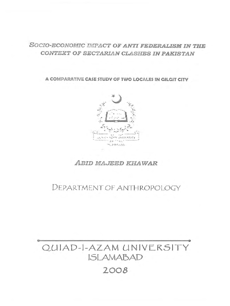 SOCIOECONOMIC IMPACT OF ANTI FEDERALISM IN THE CONTEXT OF SECTARIAN CLASHES IN PAKISTANA COMPARATIVE CASE STUDY OF TWO lOCALES IN CillCiIT CITY::).. . . \'.. \"i \'.. . I\' ./; W . \"\'. :.::\'i \'.\".