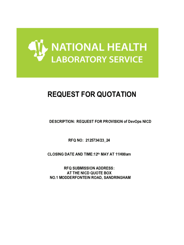 REQUEST FOR QUOTATIONDESCRIPTION: REQUEST FOR PROVISION of DevOps NICDRFQ NO: 2125734/23_24 CLOSING DATE AND TIME:12th MAY AT 11H00am RFQ SUBMISSION ADDRESS: AT THE NICD QUOTE BOX NO.1 MODDERFONTEIN