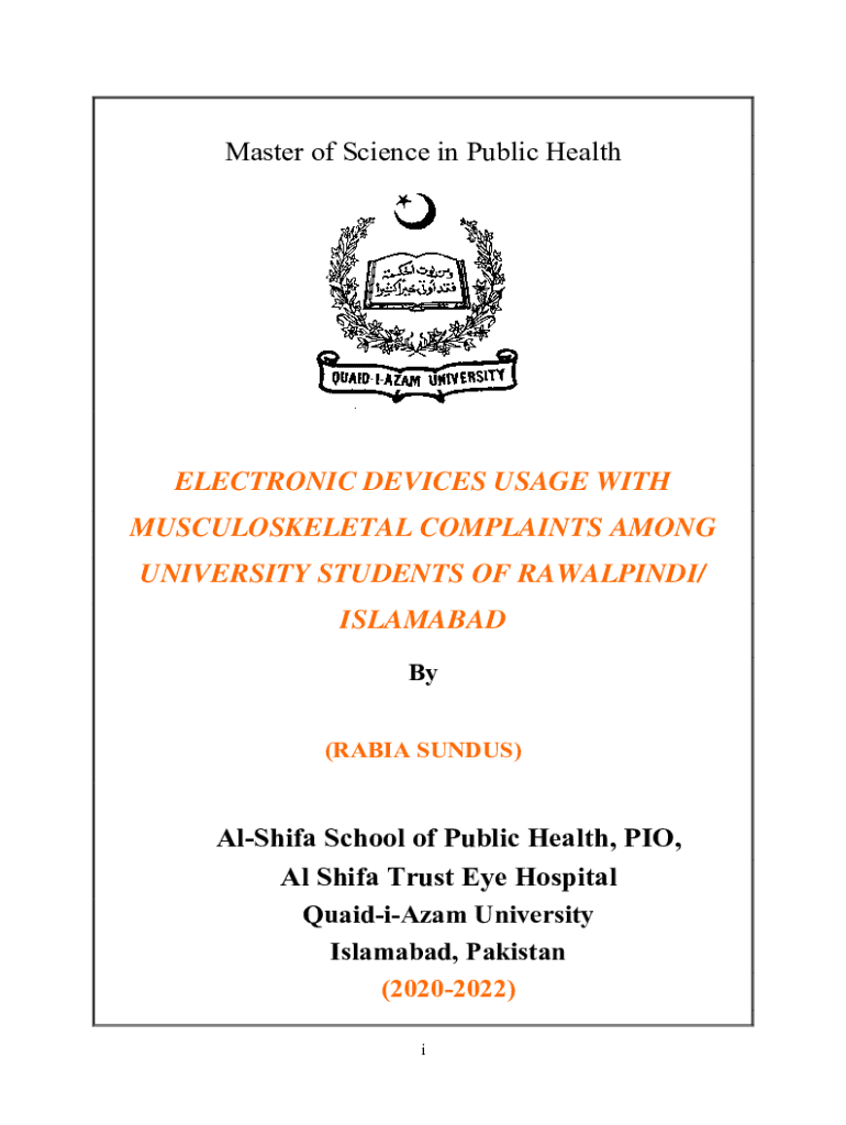 Master of Science in Public HealthELECTRONIC DEVICES USAGE WITH MUSCULOSKELETAL COMPLAINTS AMONG UNIVERSITY STUDENTS OF RAWALPINDI/ ISLAMABAD By (RABIA SUNDUS)AlShifa School of Public Health, PIO,